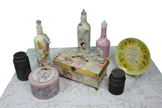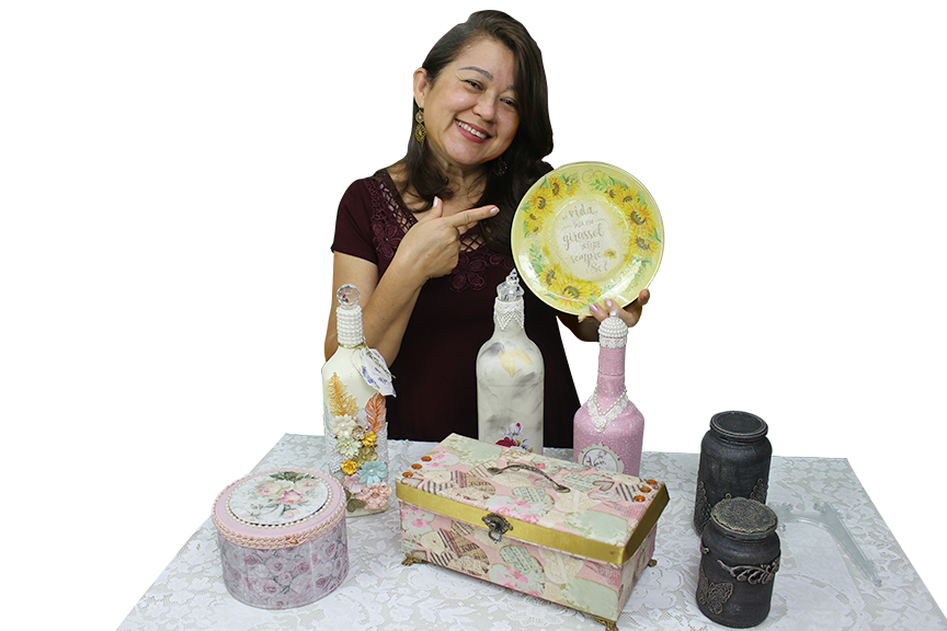 Um curso 100% online e 100% prático que mostra o passo a passo detalhado para você dominar várias técnicas que eu ensino nessas 8 peças artesanais em garrafas, latas, pratos, potes de vidro e muito mais.